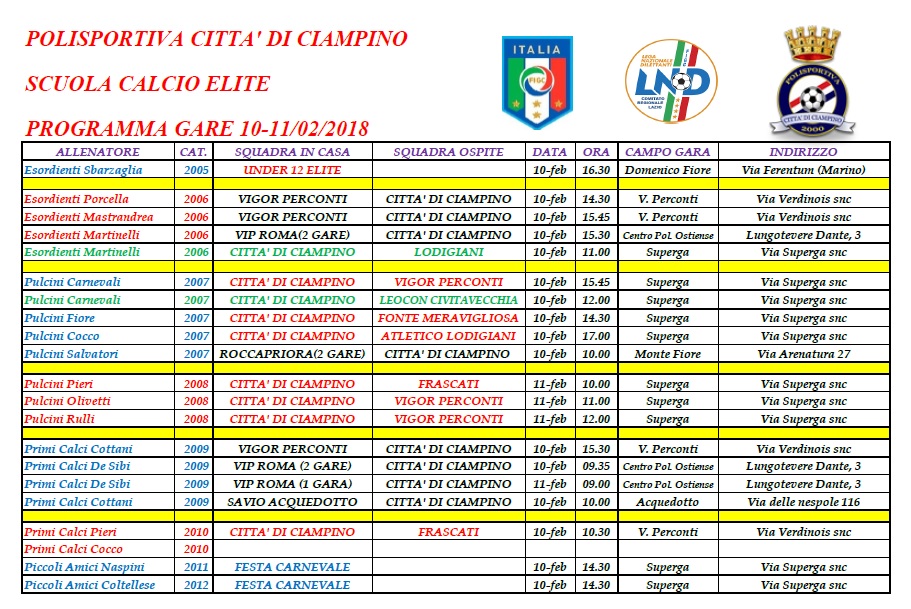 Se i più piccoli saranno impegnati nel divertente pomeriggio in maschera organizzato al Superga, non saranno questi gli unici appuntamenti del weekend per la scuola calcio del City! Come ogni settimana, infatti, tutti i gruppi della scuola calcio saranno di scena su diversi campi, con l’obiettivo di giocare a calcio, crescere e socializzare tutti insieme. Per consultare il programma completo è possibile cliccare sul link riportato di seguito: